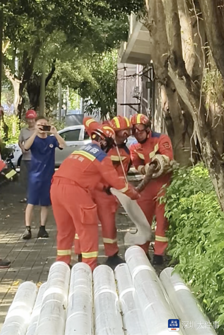 不久后,坪山消防到场处置。但由于巨蟒所处位置太高,不利于爬梯实施抓捕,于是消防员就巧妙利用现场条件,使用路边的消防栓开启高压水枪将巨蟒从树上冲下来,然后再使用捕蛇钳将巨蟒擒获,并带离现场。